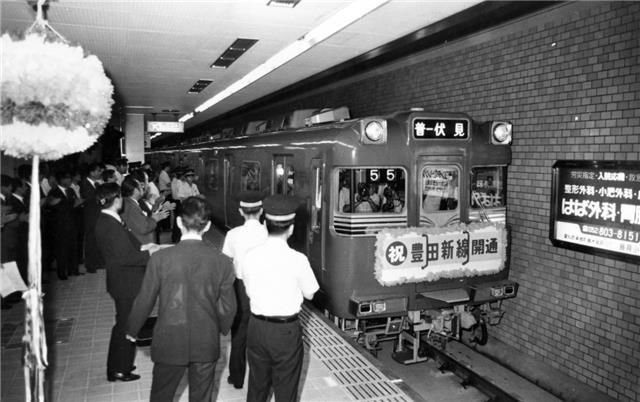 伏見・赤池間開通から約10か月後の昭和54年7月29日、鶴舞線はこの日開通した名鉄豊田線と赤池駅で接続、地下鉄の伏見駅と名鉄の豊田市駅との間で相互直通運転を開始しました。