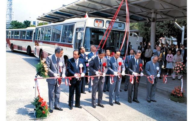 昭和57年3月28日に全国初の基幹バスが東郊線栄・星崎間(10.5km)に開通しました。道路事情から路側走行方式となりましたが、表定速度を高めるため急行運転とし、カラー舗装したバスレーン、追い抜きをスムーズにするためのバスベイを設置したほか、冷暖房完備・エアサスペンションを採用した専用車両の使用、停留所へのシェルターの設置により利用者のサービスの向上を図ります。また、一般バスと乗り継ぐ利用者のために、割引乗継料金制度を設けました。